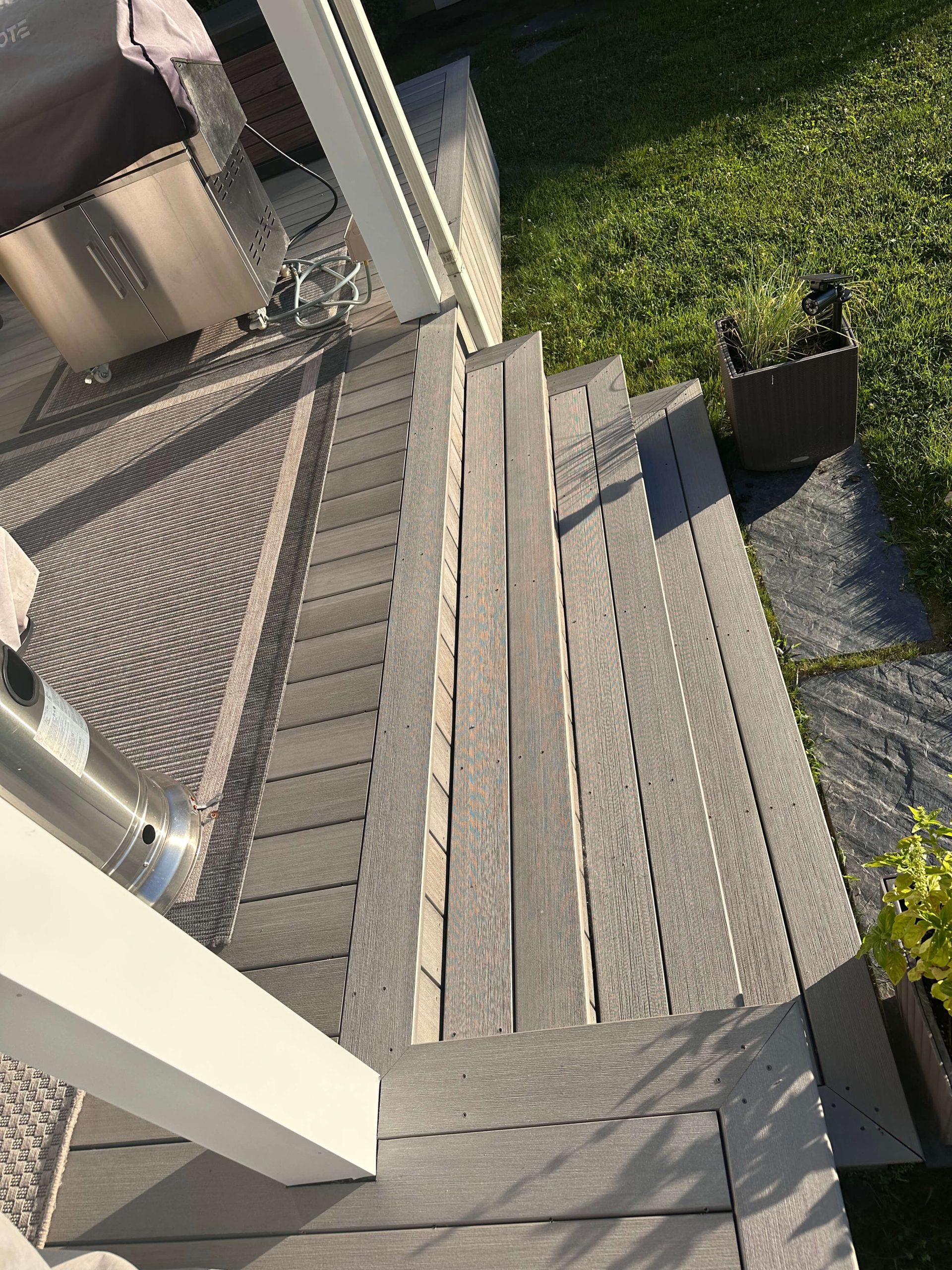 De plus, la terrasse est orientée de façon à recevoir un soleil plombant tout l'après-midi. Sur une surface de cette envergure, le bois demandait un entretien annuel exténuant (sablage et teinture) pour ne pas grisailler ou fendre sous la chaleur.
